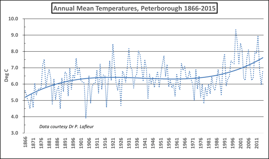 Dr Peter Lafleur graciously supplied the following temperature records for Peterborough from 1866-2015.