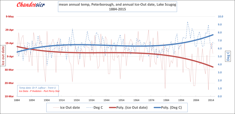 The Scugog data set (1884- 2015) comes from the Port Perry Star, courtesy of P. Hvidsten. The following graph shows the Scugog Ice-Out plotted against the Peterborough annual mean temperatures, and there is a striking inverse correlation.