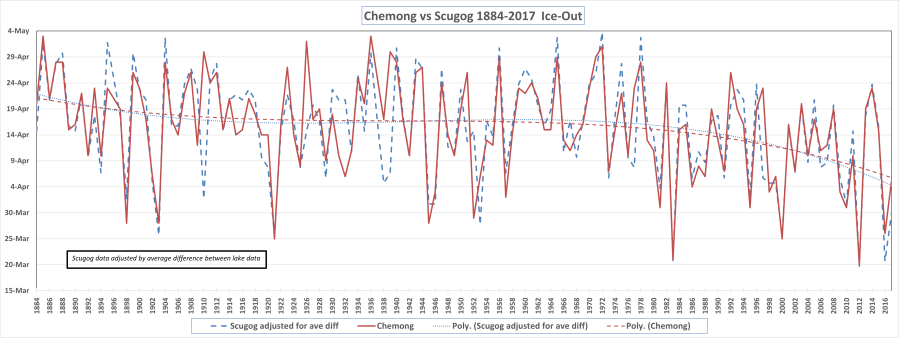 In April 2020 Steve Kirton supplied historical Ice-Out data for Chemong Lake from 1877- 2020. Chemong Lake is a similar lake to Scugog, in that it is shallow and a flow-through lake. The Ice comes out of Scugog approximately 5 days ahead of Chemong, on average. After adjusting for this offset, we overlaid the ice-out dates and there was a remarkable similarity.