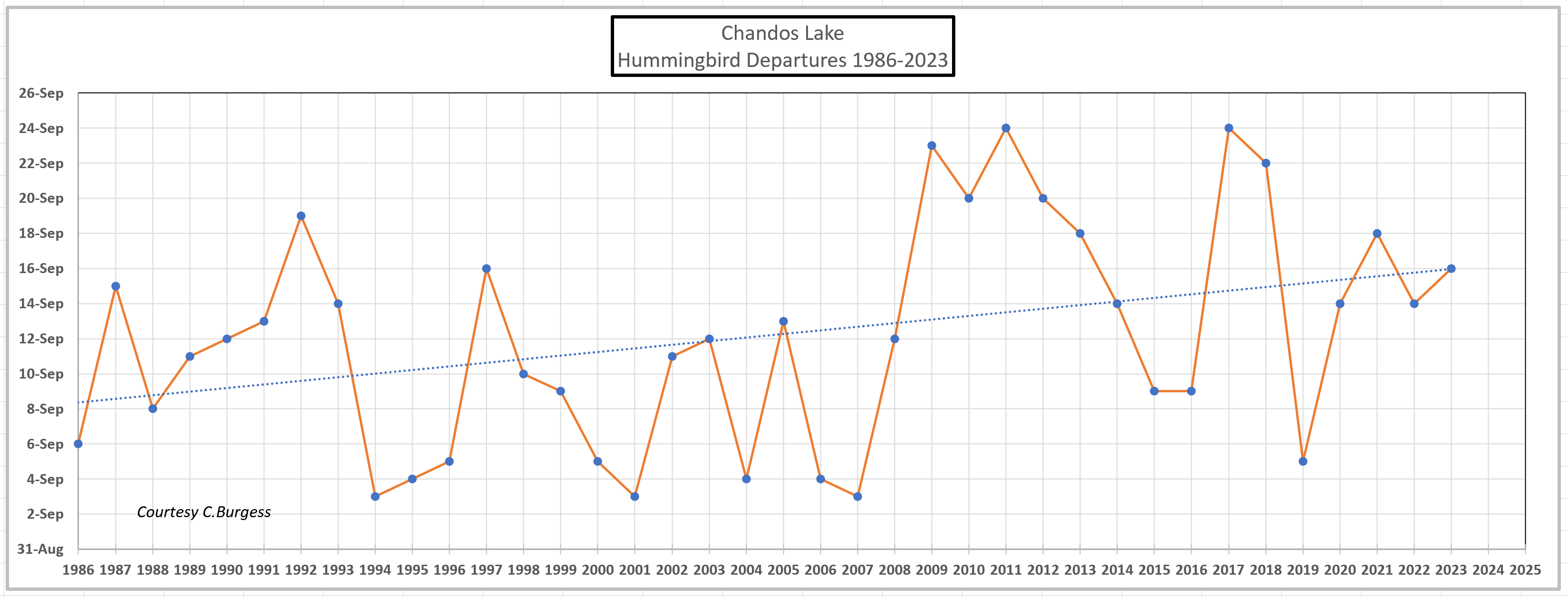The arrival date only varies a slight amount, and on trend has only varied a couple of days from May 8. The 2023 departure 2023 trend-line indicates that the birds depart around September 16, for a season about 130 days long. (So they are out-of-country quite a bit longer than they are in Canada)