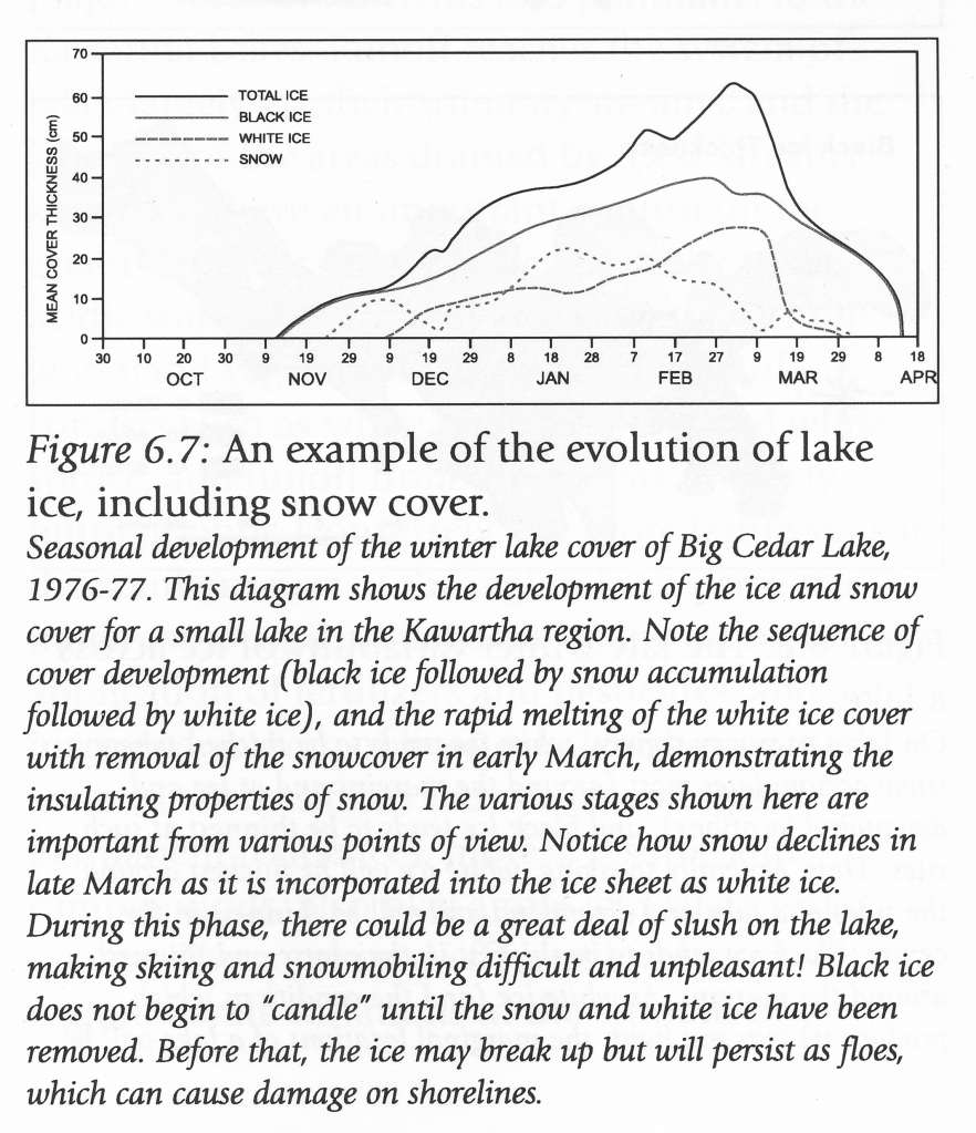 First off, the book “Peterborough and the Kawarthas” by Peter Adams and Colin Taylor (Trent University) addresses the subject of the lakes in winter very well (Chapter 6). The following section on the nature of ice and snow cover draws from this reference. Peter Adams has graciously allowed the use of his fig 6.7 below.