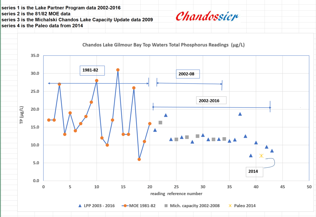 Spring phos levels tend to be lower if there is a flushing effect from in-flowing rivers. Chandos, being a head lake, likely does not receive as great a benefit from its relatively small watershed as do those lakes on the Trent Severn Waterway.