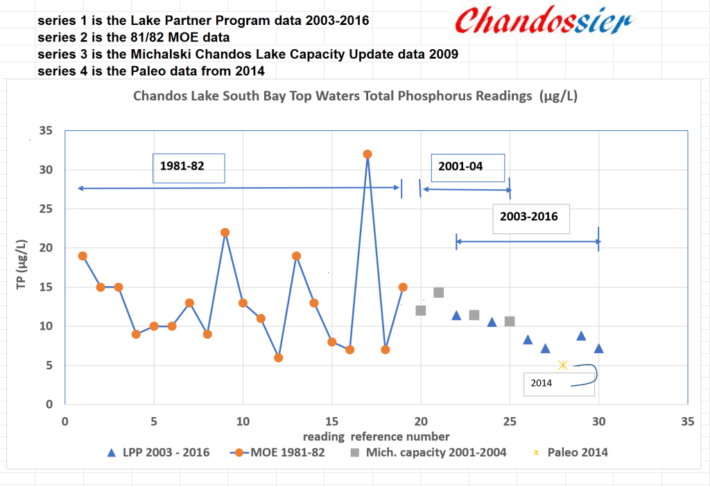 The chart below shows South Bay phosphorus readings from the epilimnion (top waters) from various sources back to 1981.