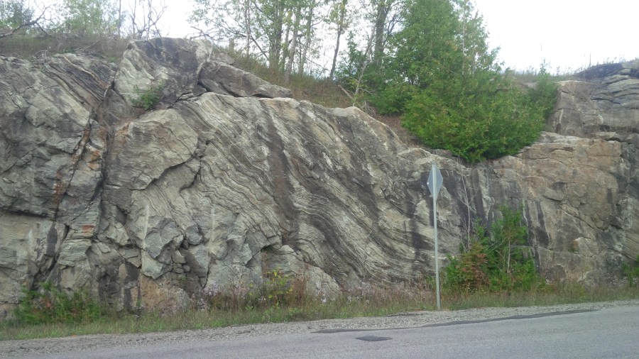 The Apsley Gneiss can be found at Wolfe Hill (shown in this old postcard) on Cty Rd 504 just east of Apsley. It is an interesting rock formation that shows how the rock was at one point deformed and metamorphosed under great heat and pressure during the Grenville Orogeny.